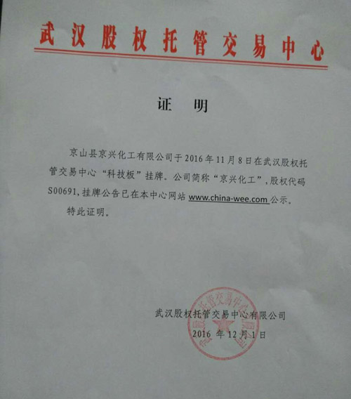 京山縣京興化工有限公司于2016年11月8日在武漢股權(quán)托管交易中心“科技板”掛牌。公司簡(jiǎn)稱“京興化工”,股權(quán)代碼S00691,掛牌公告已在本中心網(wǎng)站www.china-wee.com公示。